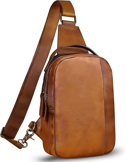 Genuine Leather Sling Bag Crossbody Purse Retro Handmade Hiking Daypack Motorcycle Shoulder Backpack Vintage Chest Bags (Brown)